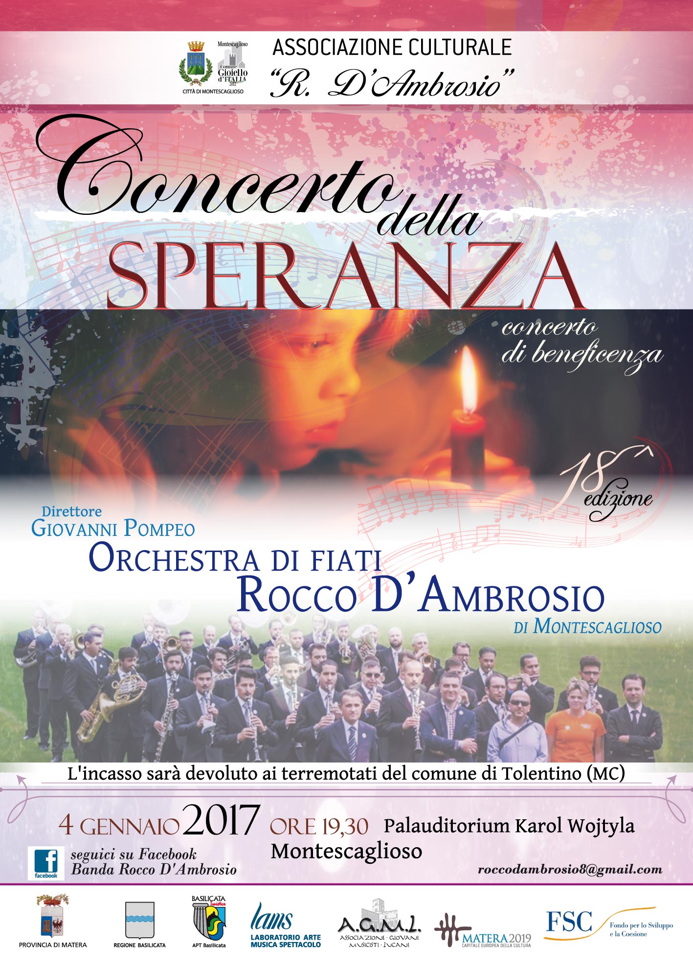 Il Concerto della Speranza è organizzato dall’Amministrazione comunale di Montescaglioso e dall’Associazione culturale “Rocco D’Ambrosio”, in collaborazione con il LAMS Matera, AGML (Associazione Giovani Musicisti Lucani) di Montescaglioso e con il patrocinio di: Regione Basilicata (Presidenza della Giunta e del Consiglio), Provincia di Matera e Apt Basilicata.